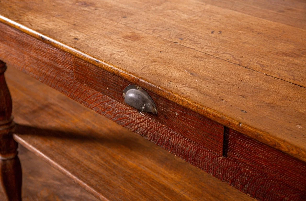 The French draper’s table was a main feature piece of furniture in cloth merchant’s shops, particularly in the 18th and 19th centuries. These lovely tables were usually made in French oak, occasionally later on in pine, and were always of a substantial length which was perfect for unrolling cloth and cutting long pieces of fabric, be it dressmaking or upholstery fabric too. Often polished, these draper’s tables may have had a single drawer or a pair of drawers for storing that ever important measuring tape and sharp shears or scissors. Some had plain legs whilst others were made with barley twist legs. Always with a lower shelf for storing rolls or folds of cloth on, these draper’s tables invariably come in lengths of 250 centimetres or can easily be up to 3 metres long.