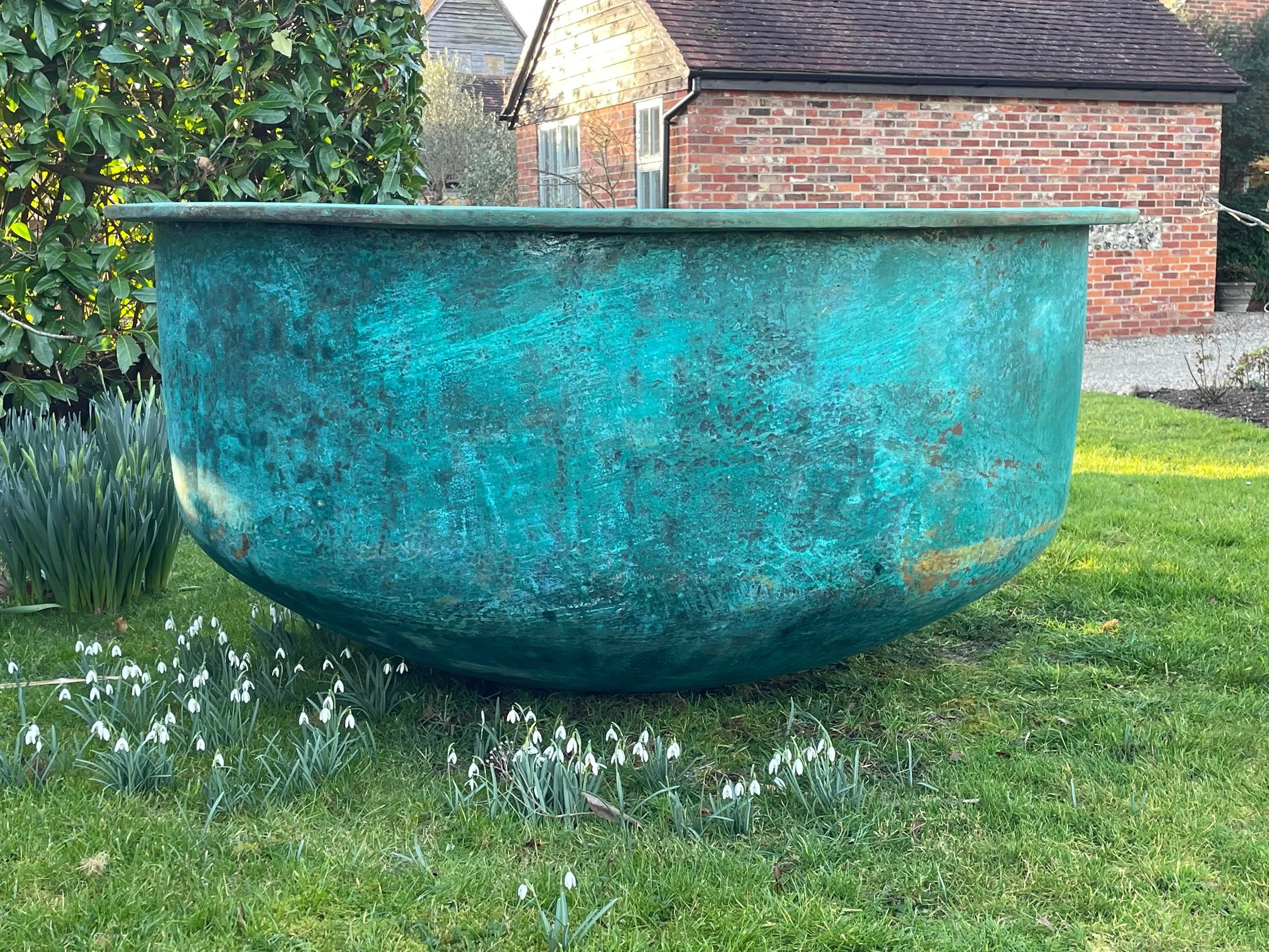 Copper vats have historically been used for cheese making both in the Alps and in other cheese making areas of France such as near the Pyrenées. Mostly, I have found vats from 170cm to over 200cm, though I think 180cm is the perfect size for a water feature. I have sold larger ones as outdoor baths or hot tubs – two of them even going back to France to beautiful Provence villas – they are very well travelled!